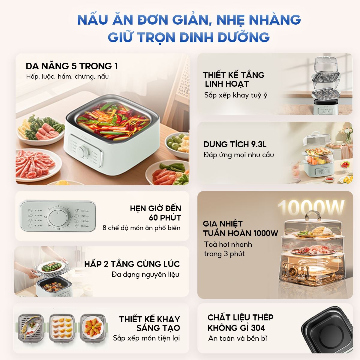 AQUA ASMC-ES902(W) được tích hợp nhiều tiện ích thông minh, tối ưu hóa trải nghiệm người dùng. Rãnh dẫn nước ngưng tụ giúp tránh tình trạng nước đọng chảy ngược vào món ăn, giữ cho món hấp luôn thơm ngon và vệ sinh. Vạch chia mực nước rõ ràng bên trong giúp bạn đong đếm lượng nước chính xác, đảm bảo món ăn đạt chuẩn hương vị. Tay cầm chống bỏng an toàn giúp di chuyển nồi dễ dàng ngay cả khi đang nóng, giảm thiểu rủi ro trong quá trình sử dụng. Các tầng có thể tháo rời giúp việc vệ sinh sau khi sử dụng trở nên đơn giản hơn bao giờ hết.