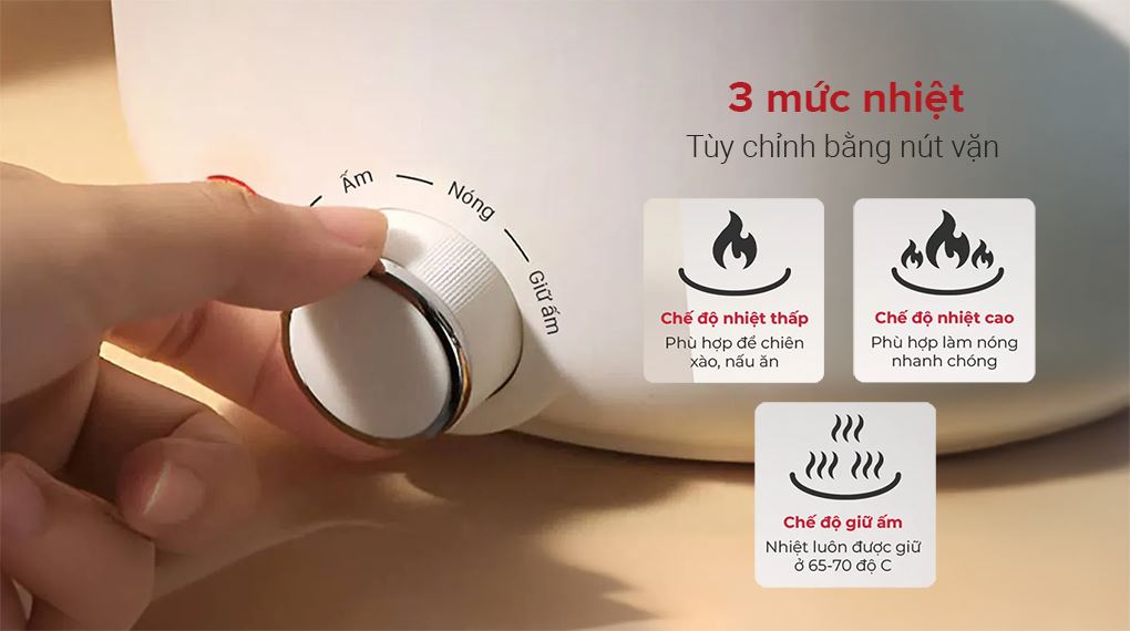 Sản phẩm tích hợp 3 mức nhiệt linh hoạt, tùy chỉnh bằng núm vặn đáp ứng nhiều nhu cầu nấu nướng khác nhau. Mức thấp phù hợp chế biến nhẹ, mức cao hỗ trợ làm nóng nhanh, trong khi chế độ giữ ấm duy trì nhiệt độ ổn định để món ăn luôn sẵn sàng sử dụng.