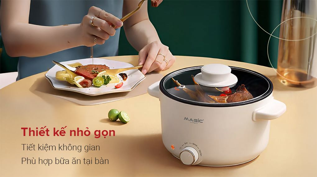 Lẩu điện Magic thiết kế nhỏ gọn giúp thiết bị dễ bố trí trong nhiều không gian bếp khác nhau, đồng thời thuận tiện khi sử dụng trực tiếp tại bàn ăn, tăng thêm sự linh hoạt trong quá trình nấu nướng.