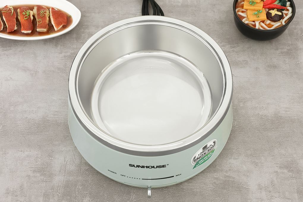 Lòng nồi lẩu điện Sunhouse được làm bằng inox 304, có khả năng chống gỉ và chịu nhiệt, giúp thức ăn ít bám dính và dễ vệ sinh. Thiết kế tháo rời hỗ trợ việc vệ sinh và bảo quản nồi sau khi sử dụng.