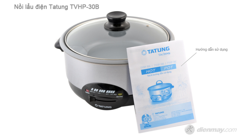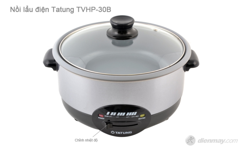 Thân nồi lẩu điện Tatung TVHP-30B làm bằng hợp kim bền chắc và tráng lớp sơn tĩnh điện bên ngoài. Quai nồi được bọc nhựa cách nhiệt an toàn sử dụng. Bạn chỉ cần đặt nồi nước vào nồi, đậy nắp sau đó gạt cần gạt đến mức nhiệt bạn muốn là xong công đoạn nấu rồi đấy.