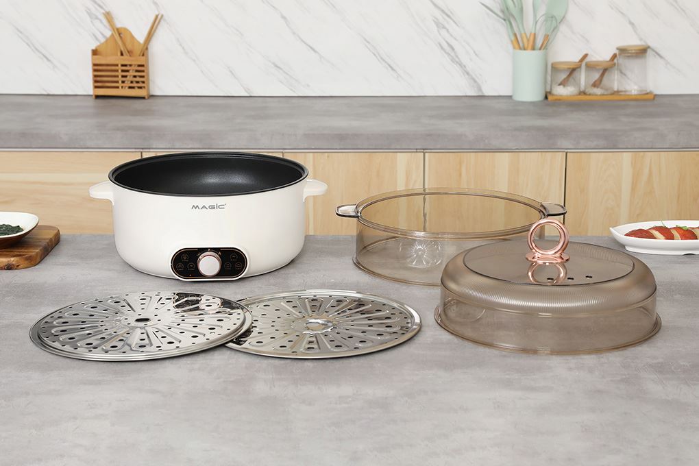 Dung tích lớn, tích hợp hấp tiện lợi, phù hợp cho những bữa ăn gia đình cần nấu nhiều món cùng lúc. Nồi lẩu hấp đa năng Magic A-092 5 lít hướng đến trải nghiệm nấu nướng linh hoạt và an toàn cho bạn trong quá trình sử dụng.