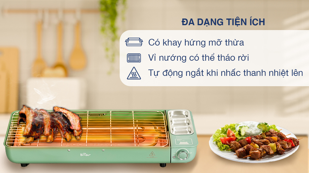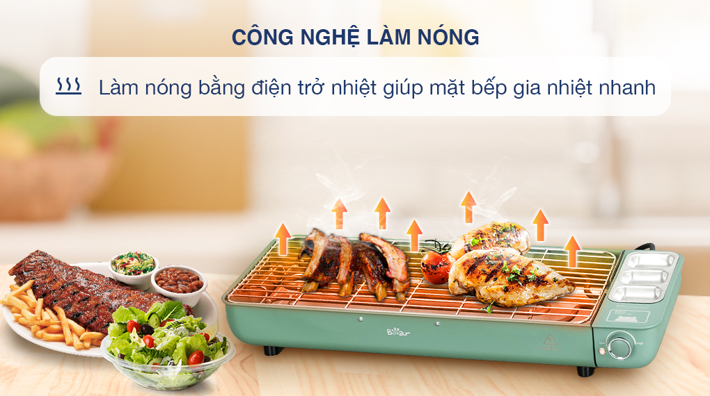 - Bếp nướng điện Bear sử dụng công nghệ làm nóng bằng thanh nhiệt, giúp nhiệt độ được phân bổ đều, thực phẩm chín đều và thơm ngon.