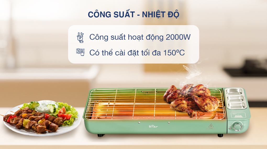 - Bếp nướng điện Bear DKL-D20M2 có công suất 2000W mạnh mẽ, có thể cài đặt nhiệt độ tối đa 150°C, làm nóng bề mặt nướng nhanh.