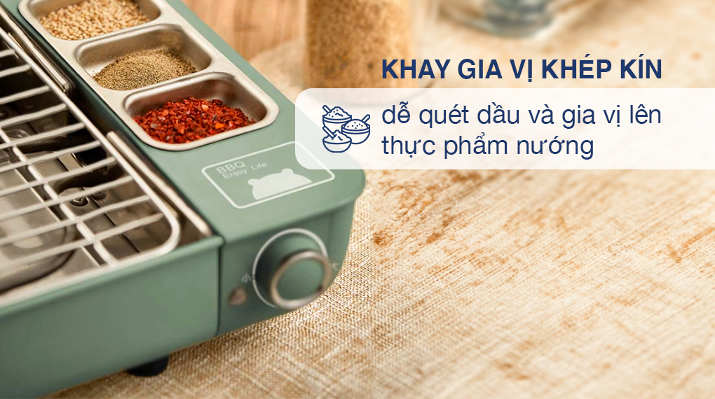 - Bếp còn có khay đựng gia vị riêng biệt tiện lợi, dễ quét dầu và gia vị lên thực phẩm nướng mà không sợ làm rơi vãi.