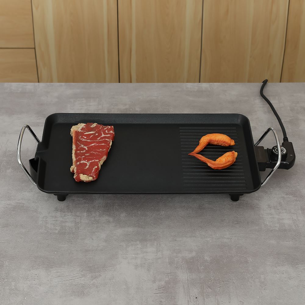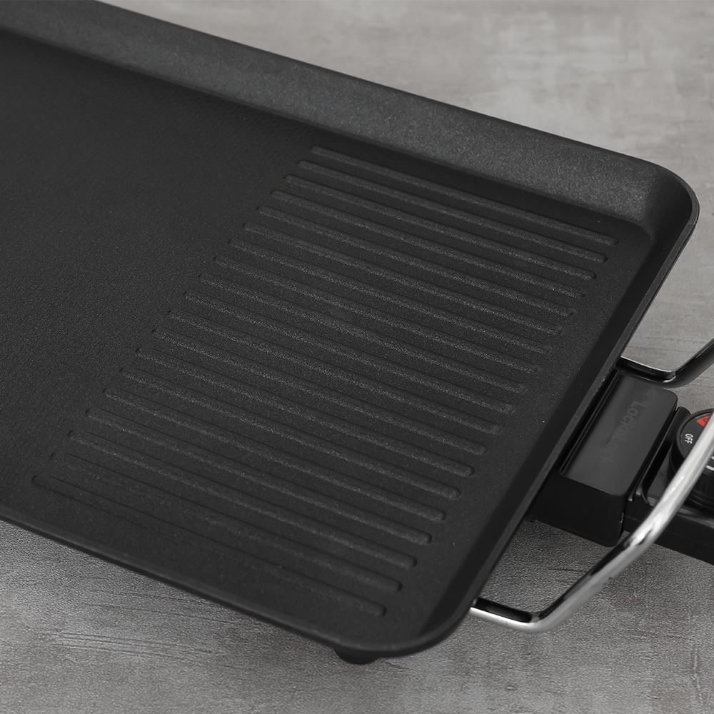 Bếp nướng điện có kiểu dáng đơn giản, tinh tế với màu đen sang trọng, dễ dàng phù hợp với mọi không gian bếp. Kích thước tổng thể 10 × 58 × 28 cm, khối lượng chỉ 2.3–3 kg nên rất tiện di chuyển hoặc cất giữ sau khi sử dụng. Mặt nướng lớn lên đến 58 × 28 cm với hai vùng nướng – một phẳng, một có rãnh – giúp chế biến nhiều loại thực phẩm cùng lúc mà không lẫn hương vị.