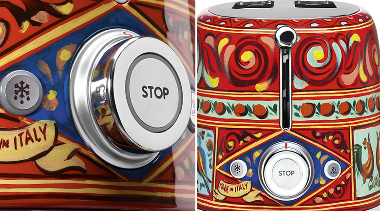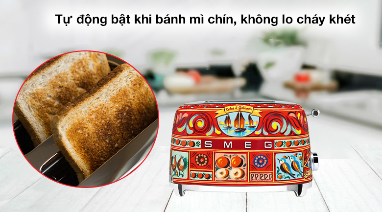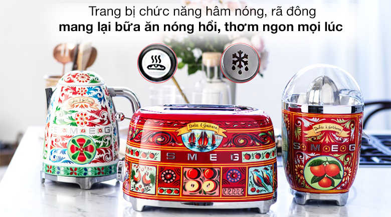 Máy nướng bánh mì Smeg D&G TSF01DGEU (535.43.680) phiên bản giới hạn với màu sắc và hoa văn độc đáo, lạ mắt, công suất mạnh mẽ 950W nướng chín bánh mì nhanh chóng, tính năng tự động bật lên khi chín không lo cháy khét, phục vụ bữa ăn sáng dễ thực hiện, mang lại dinh dưỡng cho cả gia đình.