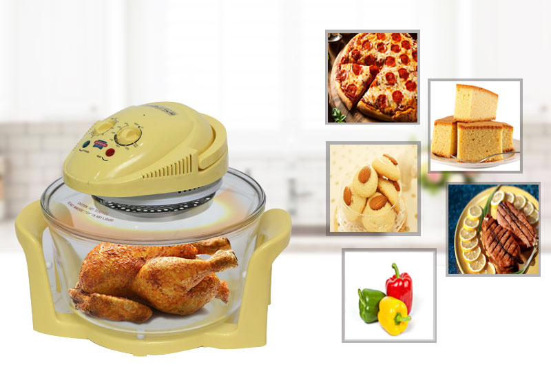 Lò nướng thuỷ tinh Sunhouse ngoài nướng gà nguyên con dưới 1.5 kg còn có thể nướng được cá, thịt và một số loại bánh phổ biến như: pizza, bánh quy, bánh bông lan...