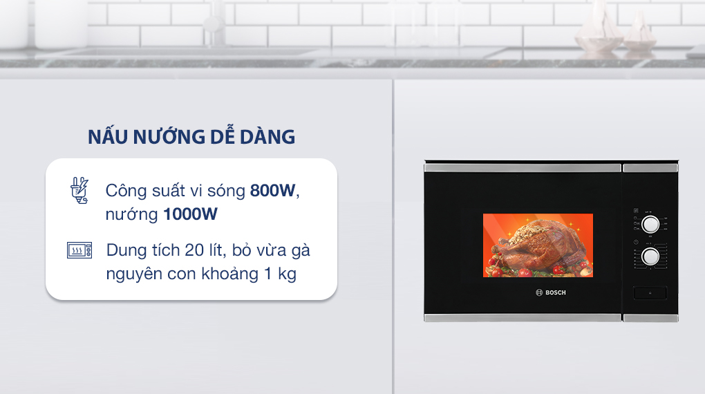 - Dung tích 20 lít, lò vi sóng có thể bỏ vừa gà nguyên con khoảng 1 kg.