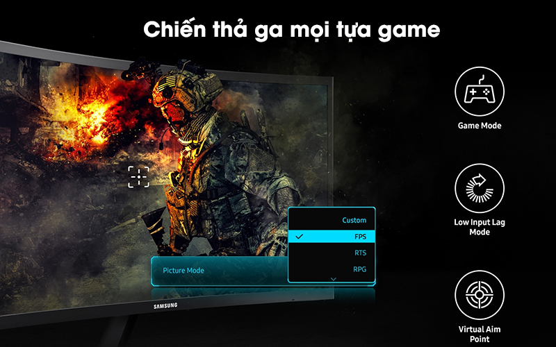 Màn hình máy tính có 3 chế độ thiết lập giúp nâng cao trải nghiệm khi chơi game của bạn. Đầu tiên là chế độ Low Input Lag giúp giảm độ trễ giữa màn hình và thiết bị đầu vào, chế độ Virtual Aim Point giúp tăng khả năng tấn công chính xác vào kẻ địch nâng cao khả năng chiến thắng của bạn, cuối cùng là chế độ Game Mode giúp điều chỉnh màu sắc, độ tương phản, độ sắc nét,... sao cho phù hợp với từng tựa game.
