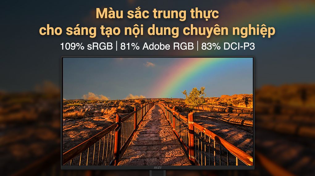 Màn hình MSI này là trợ thủ đắc lực cho những ai làm công việc sáng tạo hay đơn giản là yêu cái đẹp. Với khả năng hiển thị màu sắc vượt trội, độ phủ màu đạt 109% sRGB, 81% Adobe RGB và 83% DCI-P3, mọi hình ảnh đều trở nên sống động, rực rỡ và chân thực đến bất ngờ. Công nghệ HDR Ready còn giúp tăng cường độ tương phản, làm nổi bật từng chi tiết từ vùng tối sâu thẳm đến vùng sáng chói lòa. Nhờ vậy, từ chỉnh sửa ảnh chuyên nghiệp đến xem phim giải trí, bạn đều có được trải nghiệm thị giác ấn tượng và trọn vẹn nhất.