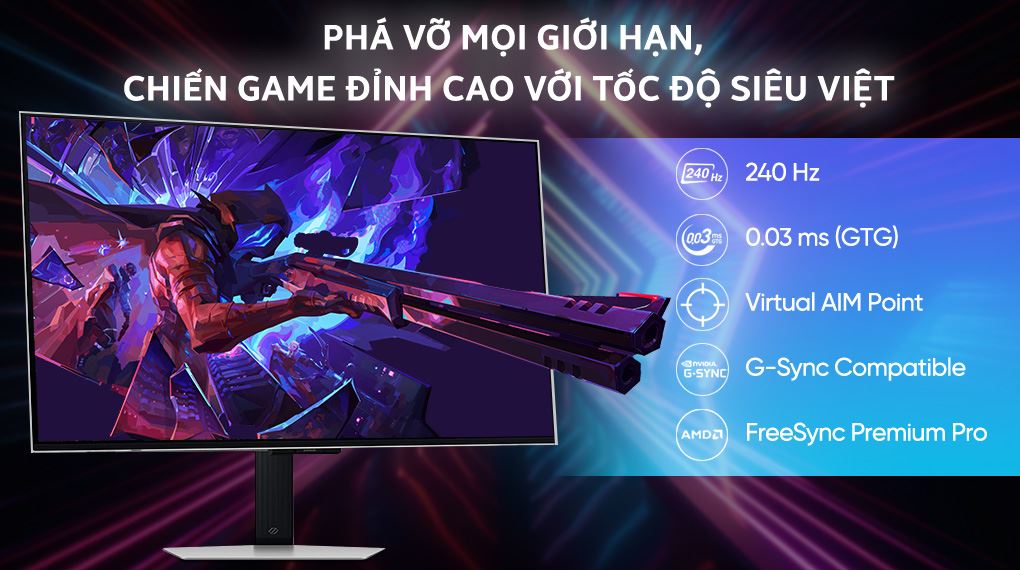 Với chiếc màn hình gaming này giúp bạn sẽ làm chủ mọi trận đấu. Tính năng Virtual AIM Point sẽ giúp bạn ngắm bắn mục tiêu dễ dàng và chính xác hơn. Đồng thời, với sự hỗ trợ của FreeSync Premium Pro và G-Sync Compatible, mọi hình ảnh sẽ hiển thị mượt mà, không còn hiện tượng xé hình hay giật lag giúp bạn tập trung hoàn toàn vào trận đấu.