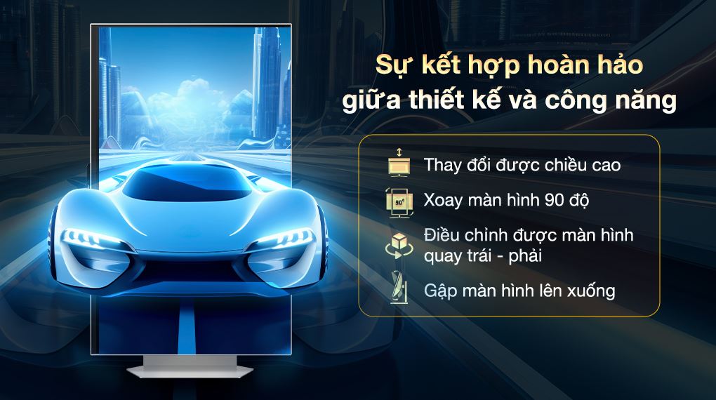 Với chân đế được thiết kế linh hoạt bạn có thể dễ dàng thay đổi độ cao, góc nghiêng của màn hình để có được tư thế làm việc tốt nhất, mắt luôn ở đúng tầm nhìn. Đặc biệt, màn hình có thể xoay dọc 90 độ, cực kỳ tiện lợi cho những ai làm công việc lập trình, nhập liệu hay đọc báo cáo. Nhờ đó, trải nghiệm làm việc hay giải trí của bạn sẽ trở nên thoải mái và hiệu quả hơn bao giờ hết.