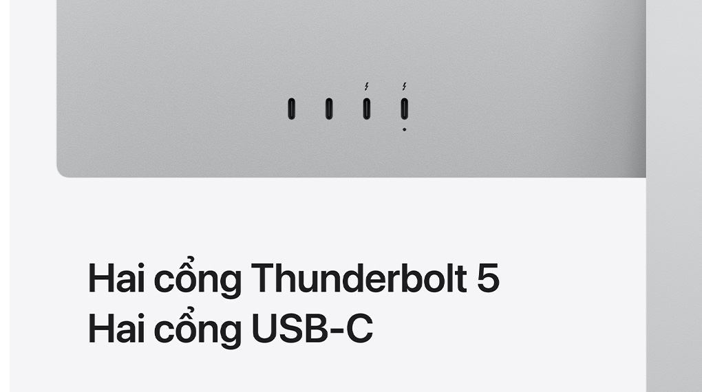 Về khả năng mở rộng, Apple Studio Display gây ấn tượng với 2 cổng Thunderbolt 5 đạt băng thông lên đến 120 Gb/s. Trong đó 1 cổng Thunderbolt 5 không chỉ truyền tải dữ liệu siêu tốc mà còn hỗ trợ sạc ngược cho MacBook với công suất tối đa 96W, giúp bàn làm việc của bạn trở nên gọn gàng hơn chỉ với một sợi cáp duy nhất. Ngoài ra, thiết bị còn có thêm các cổng USB Type-C bổ sung để kết nối nhanh với các ổ cứng ngoài, bàn phím hoặc chuột chuyên dụng.