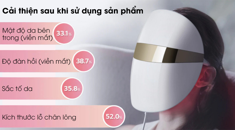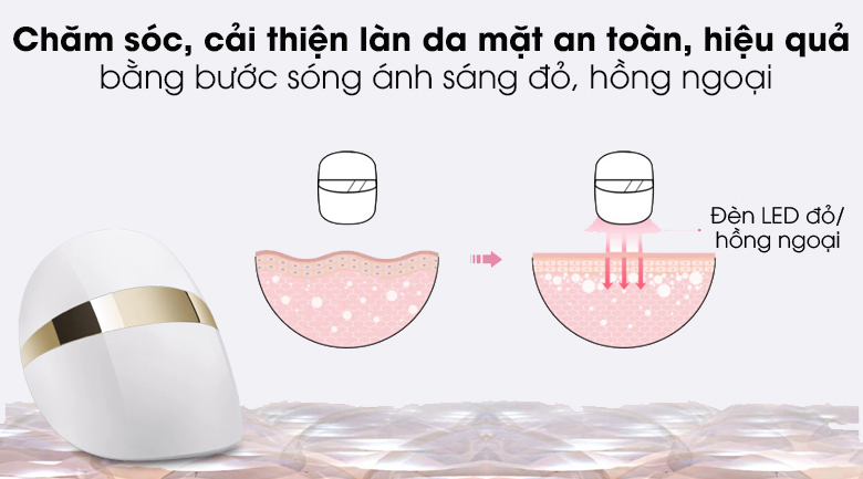 Đèn LED đỏ với phổ sóng 600 - 700 nm, đèn LED hồng ngoại với phổ sóng 800 - 900 nm thâm nhập sâu dưới da, giúp cải thiện mật độ da, độ đàn hồi, sắc tố da và thu nhỏ lỗ chân lông, cho da khỏe và đẹp lên theo từng ngày sử dụng.