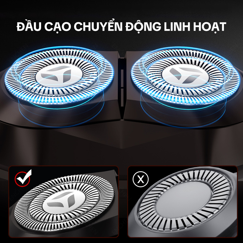 - Trang bị hai đầu cạo nổi có khả năng chuyển động linh hoạt, giúp ôm sát theo đường cong gương mặt và tiếp cận dễ dàng các vùng khó cạo như cằm, cổ hay dưới mũi.
