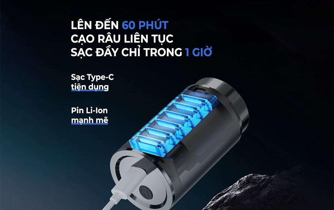 - Trang bị viên pin Li-ion cho thời lượng sử dụng khoảng 60 phút sau khi sạc đầy chỉ trong 1 giờ 30 phút.