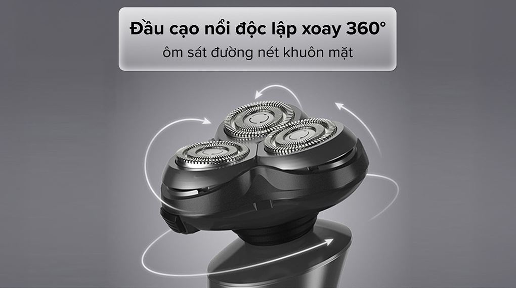 Thiết kế 3 đầu cạo nổi độc lập xoay 360°, linh hoạt ôm sát đường nét khuôn mặt, dễ dàng cạo sạch râu ở những vùng khó tiếp cận như hàm, cổ hay khóe miệng.