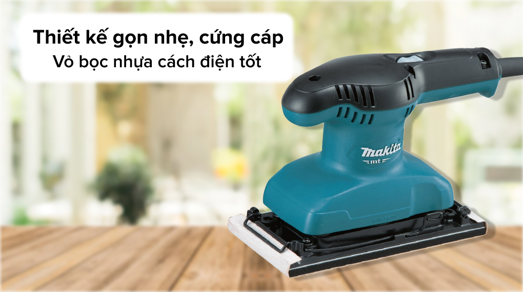 - Máy chà nhám Makita mang thiết kế nhỏ gọn với khối lượng chỉ 1.4 kg dễ dàng cầm nắm, thao tác thoải mái, giảm tình trạng mỏi tay sau quá trình dài sử dụng.