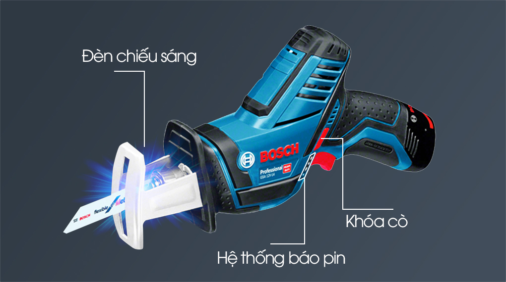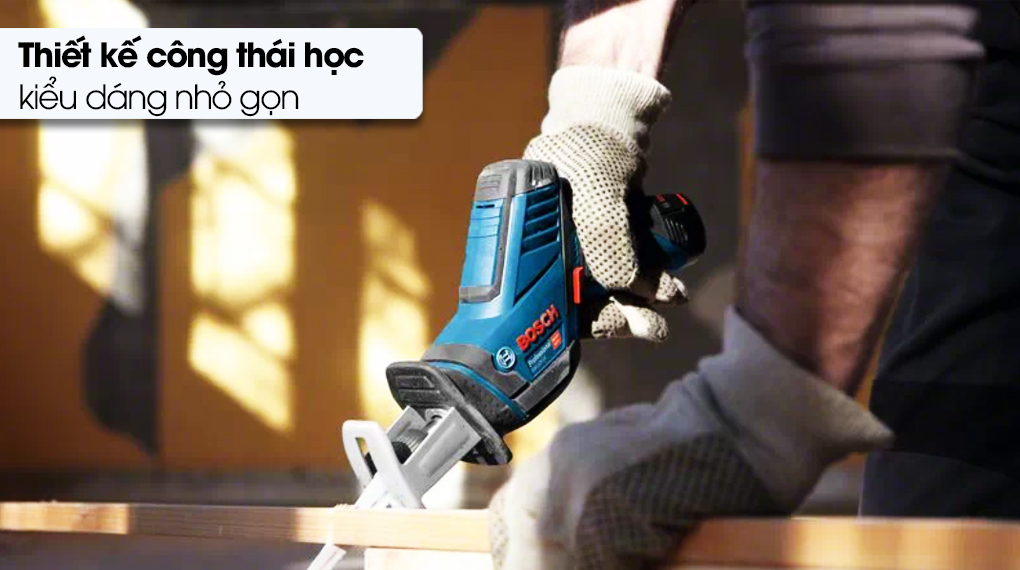 - Máy cưa kiếm dùng pin Bosch GSA 12 V-LI 12V (không kèm pin sạc) thiết kế công thái học, kiểu dáng nhỏ gọn, thao tác dễ dàng.