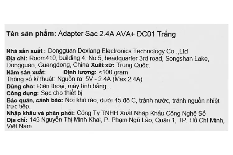 Thông số kỹ thuật Adapter Sạc 12W AVA+ DC01