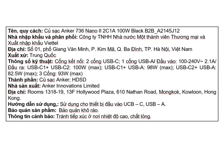 Thông số kỹ thuật Sạc nhanh 3 cổng USB Type-C 100W Anker A2145