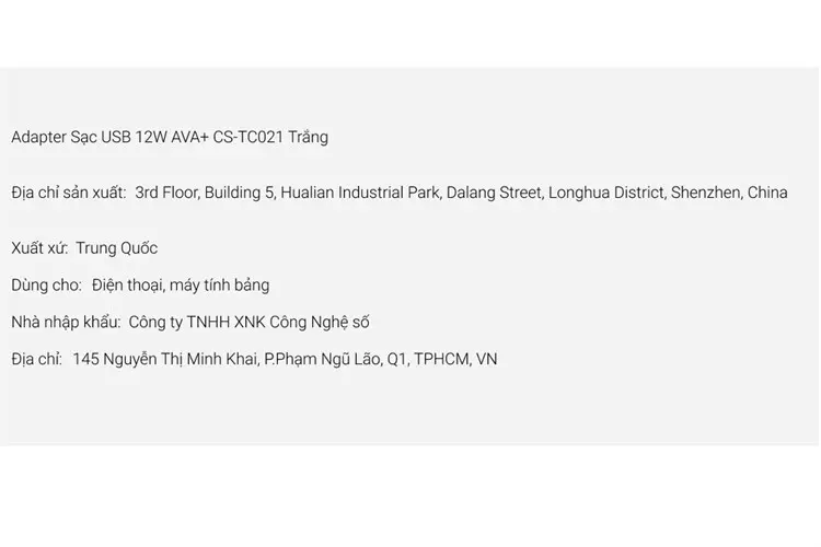 Thông số kỹ thuật Sạc USB 12W AVA+ CS-TC021