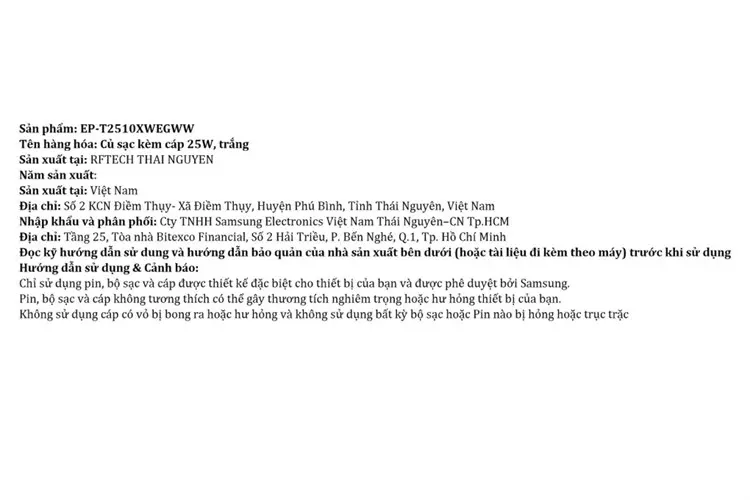 Thông số kỹ thuật Bộ sạc nhanh Type-C PD 25W Samsung EP-T2510XW kèm cáp Type C - Type C