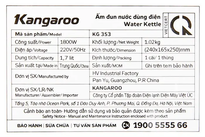 Thông số kỹ thuật Bình đun siêu tốc Kangaroo 1.7 lít KG-353