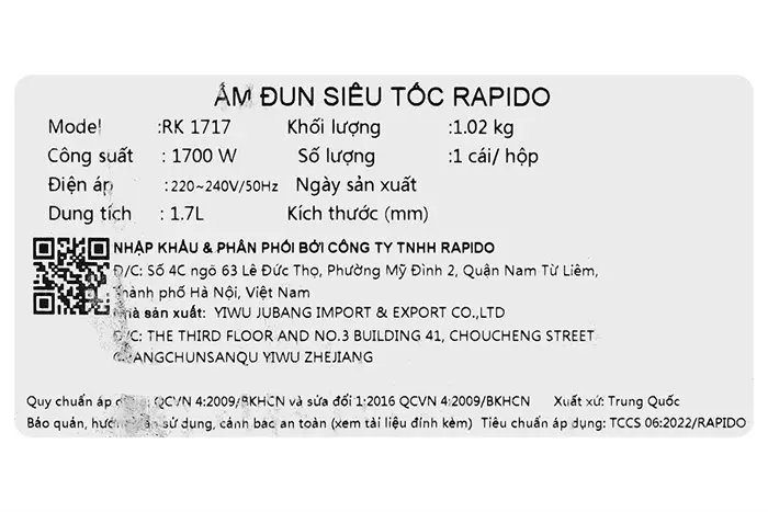 Thông số kỹ thuật Bình đun siêu tốc Rapido 1.7 lít RK1717