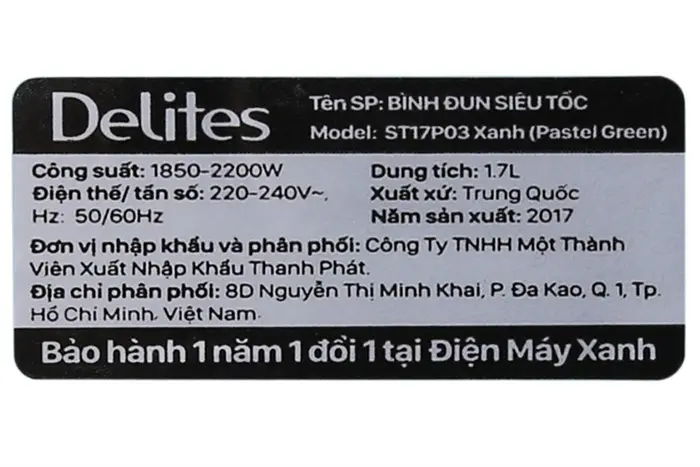 Thông số kỹ thuật Bình đun siêu tốc Delites 1.7 lít ST17P03 Xanh