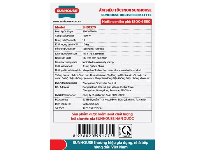Thông số kỹ thuật Bình đun siêu tốc Sunhouse 1.7 lít SHD1370