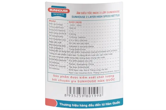 Thông số kỹ thuật Bình đun siêu tốc Sunhouse 1.7 lít SHD1382B