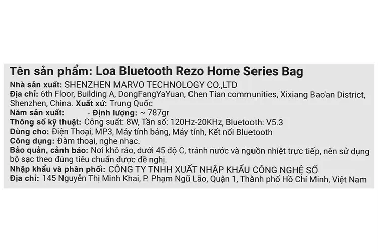 Thông số kỹ thuật Loa Bluetooth Rezo Home Series Bag