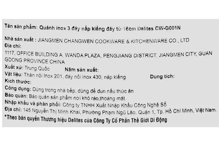 | Chất liệu nồi | Thành: inox 201, Đáy: inox 430 |