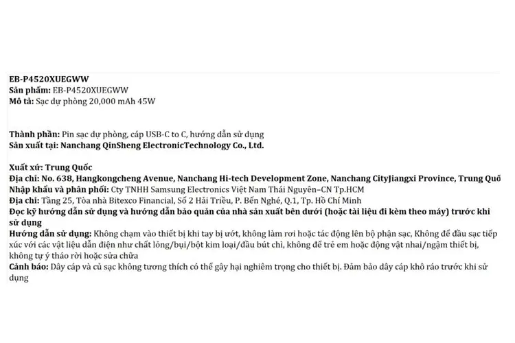Thông số kỹ thuật Pin sạc dự phòng 20000mAh Type C PD 45W Samsung EB-P4520