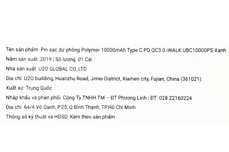 Thông số kỹ thuật Pin sạc dự phòng Polymer 10.000 mAh Type C PD QC3.0 iWALK UBC10000PS