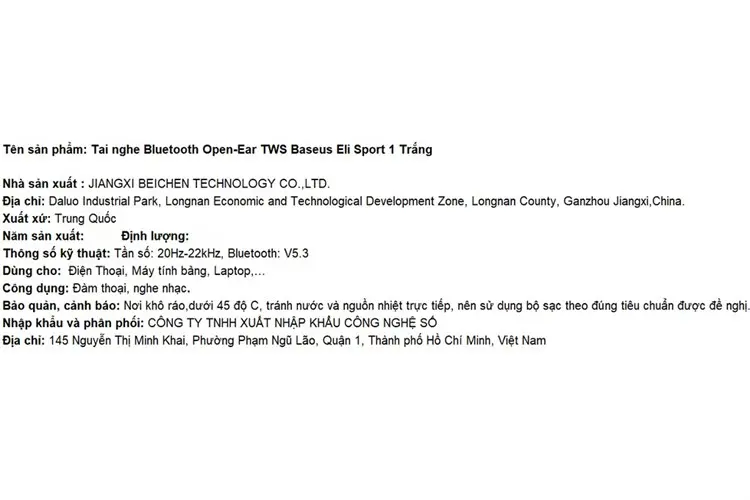 Thông số kỹ thuật Tai nghe Bluetooth Open-Ear TWS Baseus Eli Sport 1
