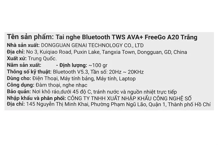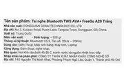 Thông số kỹ thuật Tai nghe Bluetooth True Wireless AVA+ FreeGo A20