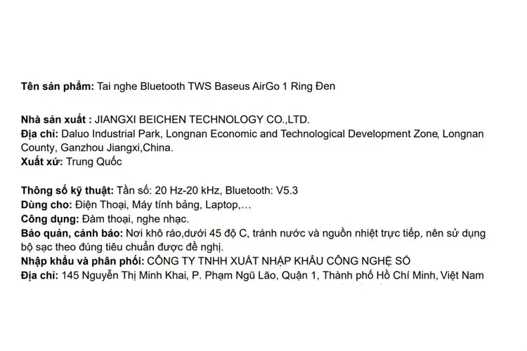 Thông số kỹ thuật Tai nghe Bluetooth True Wireless Baseus AirGo 1 Ring Open-Ear