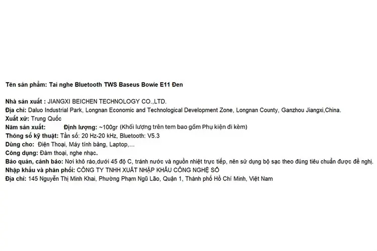 Thông số kỹ thuật Tai nghe Bluetooth True Wireless Baseus Bowie E11