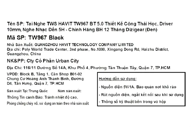 Thông số kỹ thuật Tai nghe Bluetooth True Wireless HAVIT TW967