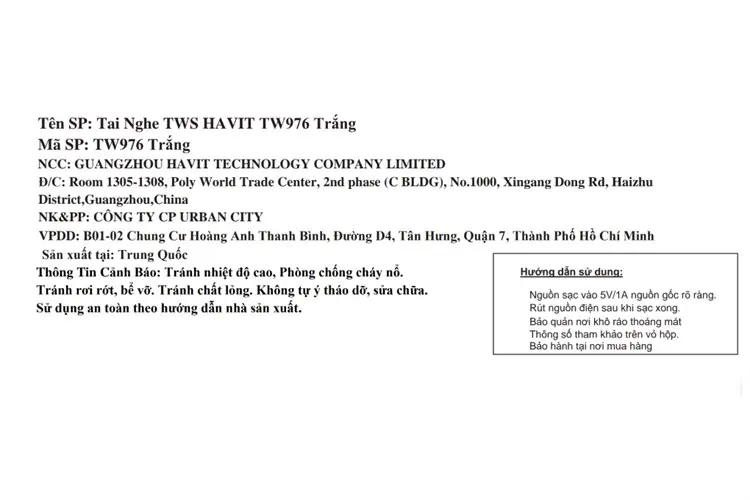 Thông số kỹ thuật Tai nghe Bluetooth True Wireless Havit TW976
