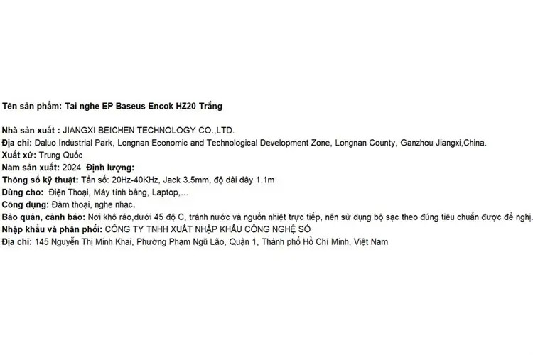 Thông số kỹ thuật Tai nghe Có dây Baseus Encok HZ20