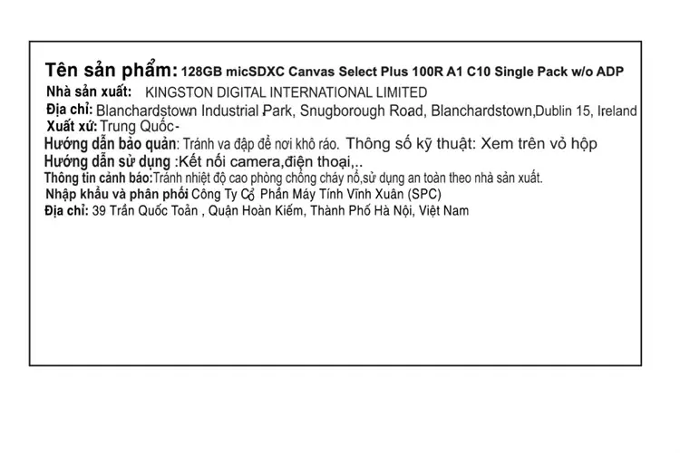 Thông số kỹ thuật Thẻ nhớ Kingston MicroSD 128GB class 10_U1