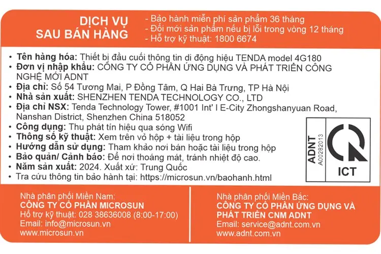 Thông số kỹ thuật Bộ phát Wifi di động 4G LTE 286Mbps Tenda 4G180-V4