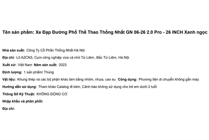 Thông số kỹ thuật Xe Đạp Đường Phố Thể Thao Thống Nhất GN 06-26 2.0 Pro - 26 inch Xanh ngọc