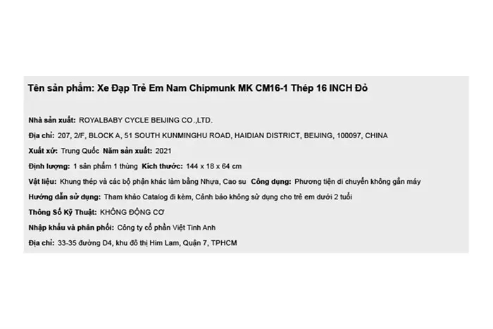 Thông số kỹ thuật Xe Đạp Trẻ Em Chipmunk MK CM16-1 - 16 inch Đỏ