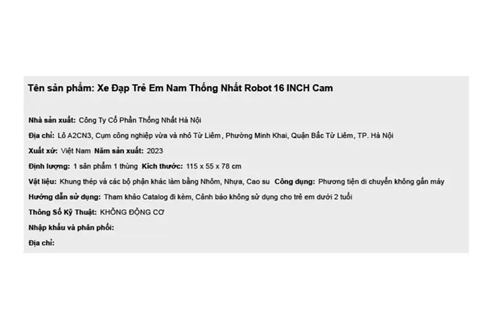 Thông số kỹ thuật Xe Đạp Trẻ Em Thống Nhất Robot - 16 inch Cam