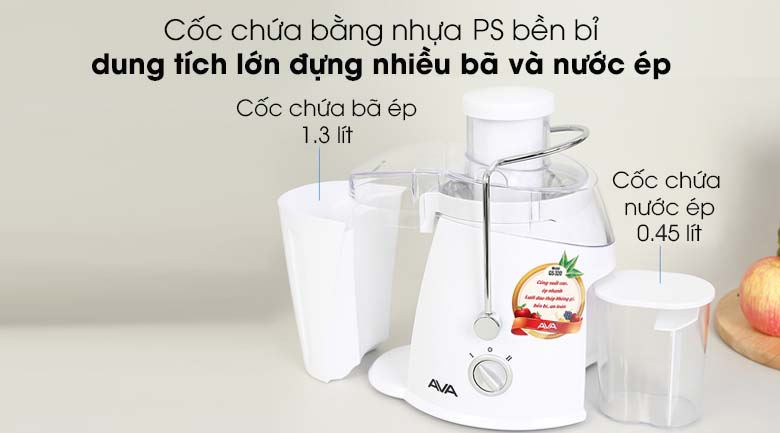 Cốc chứa nước ép có dung tích 0.45 lít, cốc chứa bã 1.3 lít, đặc biệt, cốc chứa nước ép nắp đậy riêng bảo quản nước ép sạch sẽ hơn.